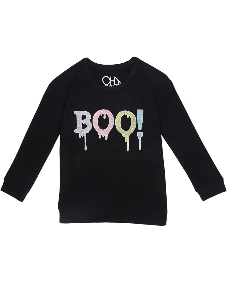 The primary materials that compose this product contain a minimum of 20 percent recycled content.SKU: #9788703Chaser® Kids Boo Recycled Bliss Knit Tee with Glitter is all treats and no tricks.Crew neckline with long sleeves.