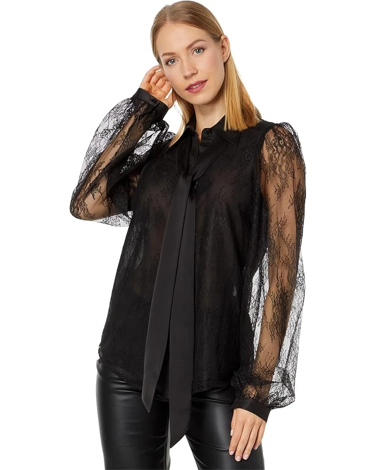 A romantic touch and an elegant silhouette, the EQUIPMENTâ„¢ Linneta Tie Neck Blouse comes with a mesh fabric construction on the sleeves and the bodice.SKU: #9853747Collared neckline and long blouson sleeves.Buttoned front closure.Self-tie closure on the front.Panel cuffs.Curved hemline.Contrast: 100% silk;