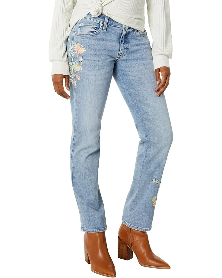 Embrace a classic look and experience premium comfort during those laid-back days wearing the Lucky Brand® Sweet Straight Jeans in Weekend.SKU: #9856183Mid-rise, easy fit with straight leg silhouette.Zip-fly and button closure.Belt loops on the waist.Classic five-pocket construction.Eye-catching floral embroidery with studded detailing.Whiskered and faded detailing.Logo label on the back waist.91% cotton, 7% polyester, 2% Lycra™ elastane.Machine wash, tumble dry.Imported.Product measurements were taken using size 27 (US 4), inseam 30. Please note that measurements may vary by size.Measurements: