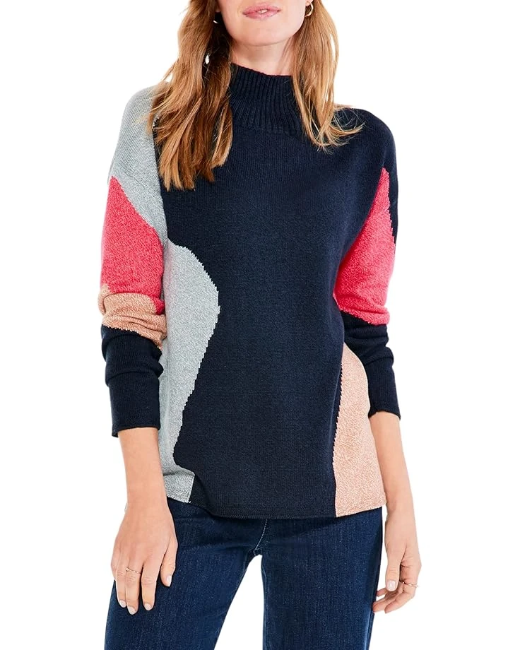 Keep yourself comfy and cozy wearing NIC+ZOE® Petite Glowing Embers Sweater.SKU: #9854730Easy fit.Midweight.Pullover style.Mock neck.Dropped shoulders.Long sleeves.Color-block intarsia pattern.Side splits on hem.Sits at hip.55% cotton, 35% acrylic, 10% rayon.Hand wash, dry flat.Imported.Inseam length: Petite: 23.5 in.