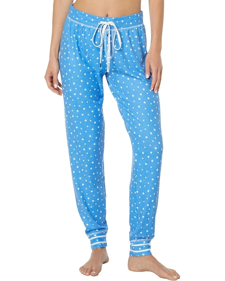 Lounging hours and movie time is more fun in the relaxed and comfy P.J. Salvage® Blue Star Pants.SKU: #9870959Pull-on style.Elasticized waistband with drawstring.Swen fly with button detailing and contrasting stitched accents.Allover star print detailing.Banded cuffs.81% polyester, 14% rayon, 5% elastane. Machine wash, dry flat.